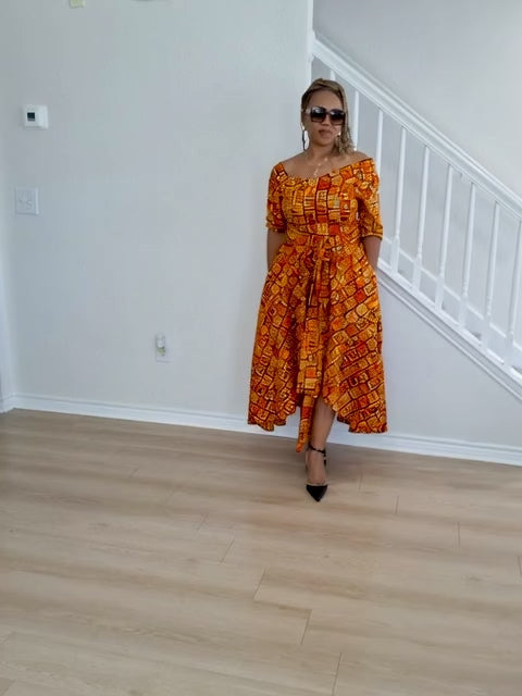 Product Description: Step into effortless elegance with this off-shoulder Ankara High-Low dress. The bold, geometric orange pattern gives a modern twist to the classic African print. Perfect for warm or cool weather, this dress combines style and comfort, making it a great choice for casual or formal outings, garden parties, or beach vacations.